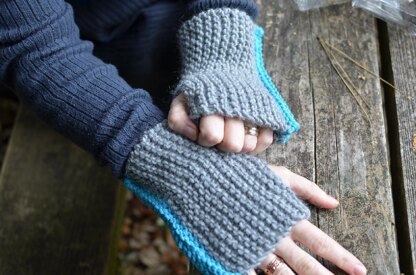 Mishima is a pair of soft, warm and modern fingerless mitts with an exposed seam in a contrast colour.