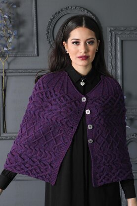 This gothic cape uses cables in usual ways to recreate medieval designs and intricate gothic motifs. The body of the cape is worked sideways, then turned on its side. Stitches are picked up along one edge for the yoke which is worked up to the neck bind. This is a great cape to wear open, like a shawl or cozy blanket draped around your shoulders.