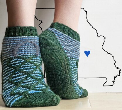 Hills, lakes, and the famous Gateway Arch! This is a sock with an unusual construction. Inspired by Elizabeth Zimmerman’s Moccasin Sock, the leg and top of the foot are worked first, then the toe, heel, and finally the sole of the foot.