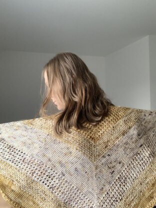 Misty Sunrise Shawl is reminiscent of cool autumn foggy city mornings when sunshine works its way through thick layers of mist resulting in a milky white and yellow mixture on the background of urban scenery. The two colours in the shawl are combined using stitches and sequences to highlight each colour and their combination to create an effect comparable with the natural spectacle. The shawl is made using Tunisian crochet technique. It is a medium size shawl that is a great layering option for colder weather.