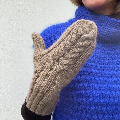 Mittens35 are mittens worked with cable pattern. In the beginning, ribbing is worked around the wrist and continuing to the cable pattern. The mittens are worked in a cable pattern. Stitches are placed on hold for the thumb and the mittens are worked until the desired length before decreases on either side of the mittens to create bowing at fingertips. The thumb is worked by picking up stitches and worked in stockinette until decreases. The mittens are assembly free.