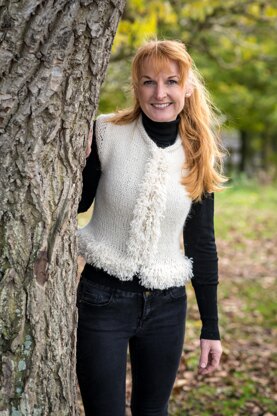 This flattering gilet is made in chunky yarn and the fake fur effect is created within the knitting. Made in three pieces, shaped with darts so it has a tailored fit and and short row shaping creates the curved panel at hem. The two fronts are made differently and the right side has a placket so it is easy to join the them both together with press studs or a toggle if you prefer.