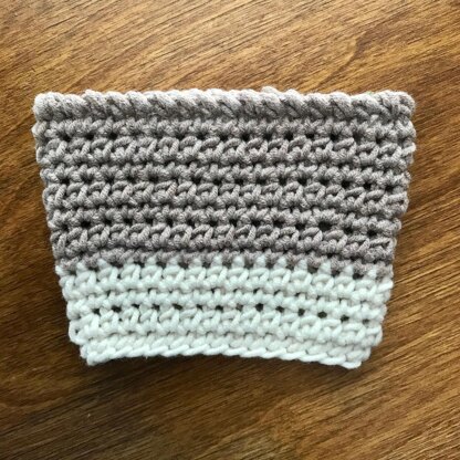The MJ Cozy Cup Sleeve pattern features the Crab Stitch and is designed to fit cups, travel mugs, and pint glasses that are wider at the top than at the bottom.