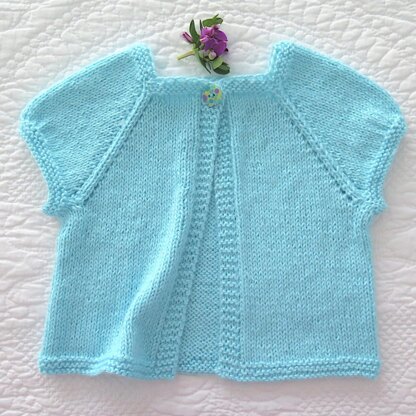 This seamless baby cardigan is made top down with integrated neck and button bands. When the knitting is finished just weave in the ends and sew on the button. With a cute neckline, made with a very simple cast on that creates little loops along the edge, a bit of eyelet decoration along the raglan increases in the yoke, short slightly blouson sleeves and a length that goes a bit below the waist, making it perfect for layering over a summer dress or tank top.