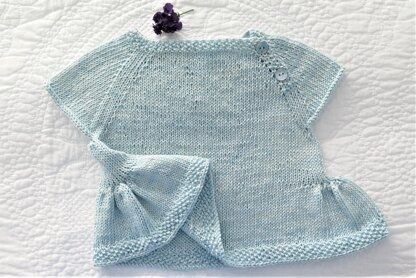 Inspired by the very stylish evening dresses worn by “Lady Rose” in Downton Abbey, this cute summer top flares out at the sides, has a button placket down the side of the yoke so there’s plenty of room for easing the top over baby’s head, and is mostly stocking stitch with a bit of decoration using moss/seed stitch for the neck band and hem.