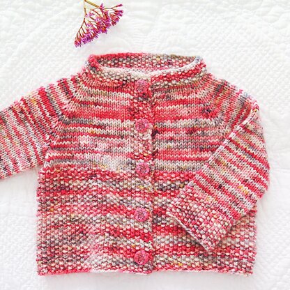 This is a very simple mix of moss stitches & stocking stitch that gives the cardigan a bit of style (& is also very easy!). To bring the front of the neck band down a bit, we do some easy short rows after the neckband. This pattern is suitable for baby boys & girls, depending on the yarn colour & buttons we choose.