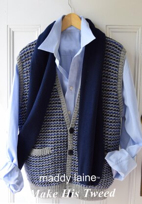 A maddy laine patterm for a men's vest with the front sections knit in a slip stitch tweed pattern. Choose yarn colors in a light, medium, and dark shade to yield an ideal result for this pattern stitch. The vest features V-neck shaping and front knit-in pockets. The back section is knit in plain stockinette (stocking) stitch.