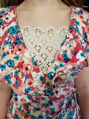 A pretty lace insert designed to extend the neckline of your blouse or dress while adding a touch of lace. Simply pin to your bra or blouse or add 1/4” ribbon ties to each corner and center bottom.