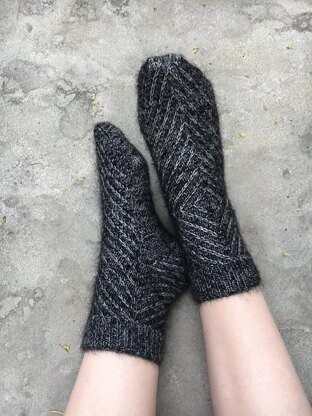 The Mohair Magic socks are knit holding a strand of laceweight mohair together with a regular sock yarn. This combination, especially when combining a dark and a light yarn, gives the finished work an amazing sheen and softness. The finished object will appear to shine! Paired with some simple 1/1 cables in a diagonal striping pattern these socks look very luxurious, but they are in fact a fairly easy knit.