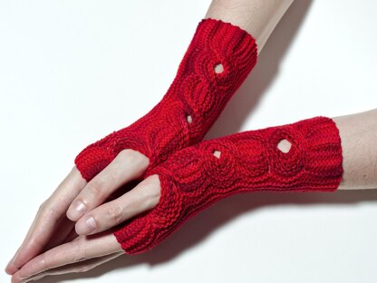 These elegantly cabled mittens are knitted sideways, in rows. They feature horizontal cables that can be used as thumbholes. The pattern is derived from a crochet pattern, my "Himbeerwellen". I used to think that horzontal cables (which I invented for crochet) were too fiddly to knit --- you'd need way too many cable needles. When I looked at knooking instructions, I realized that lifelines are the solution. So, this pattern came to life and horizontal cables are invented for knitting --- and this is the first ever pattern featuring them.