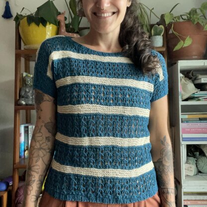 The Mojave Tee is a drop-shoulder summer tee featuring lace sections separated by garter rows in a contrasting color. The boxy body and positive ease gives it a modern, easy-to-wear fit. Knit up in Kelbourne Woolens Mojave yarn, available in a wide range of solid colors. The Mojave Tee is the perfect statement piece for your handmade summer wardrobe!