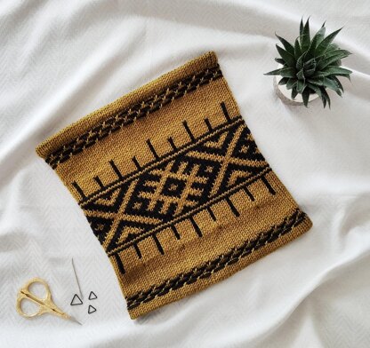 Mokum is knit in the round from the bottom up beginning with a provisional cast on. A folded hem is created and the cowl continues in charted colorwork. Stitches are picked up on the wrong side of the work and Kitchener Stitch is used to graft the two rows together, binding off stitches.