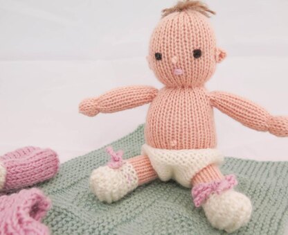 A pattern for an adorable knit baby doll.Molly wears a nappy and loves to snuggle in her heart lovey blanket. When she goes out, she likes to wear a dress and matching bonnet.