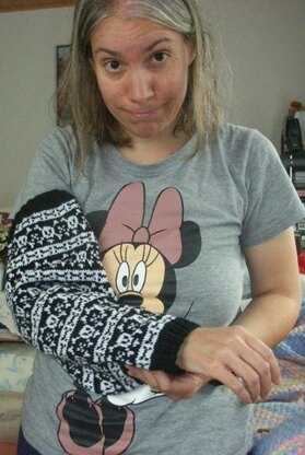 It's very loose so it also fits as a cast cozy. You can knit it tighter by leaving out pattern repeats and making the ribbing less wide.