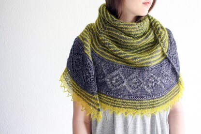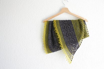 About the construction, it is a project that is knitted top down with a set of increases and stocking stitch/garter stitch stripes on the first part. The lace edging is then worked laterally. Finally the stitches are picked up to add some more stripes before the small loops border.