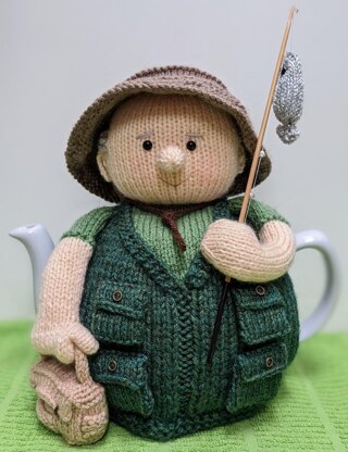 This cosy will fit a traditionally shaped 6 cup tea pot. The cosy body is knitted using 2 strands of DK held together. All other pieces are made with a single strand of yarn. You will also need: Toy stuffing, 6mm eyes, 4 small buttons for gilet pockets, 2 black beads for the fish, a bamboo skewer for the rod and 5 split rings for the rod (optional)