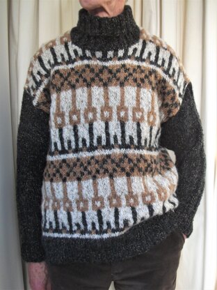 An exciting and interesting Scandi influenced colour-work sweater, with a lovely modern look. The sleeves are in stocking stitch with a centre rib panel. A cosy polo neck finishes the design perfectly. A plus with this design is that on the back and front all wrong-side rows follow the colours used on the previous row - easy!