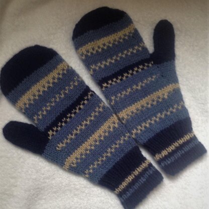 Moody blues is the name of these mittens. Wear them with the pattern on the front or turn them over and have some fun stripes. Whatever the mood takes you. These are worked flat on two needles with a seam. There are 3 sizes to choose from. Knitted in a DK yarn so they are not to bulky, but nice and warm.