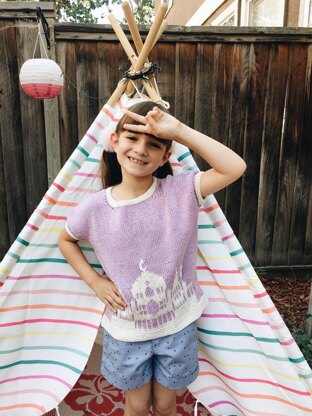 The castle design, along with the crescent moon, is inspired on the Sailor Moon Anime and Manga. This tee is knit from the bottom up in the round, starting with a garter stitch border. The instructions are both written and charted. The back and front are separated and worked back and forth in stockinette stitch; the shoulders are grafted together with Kitchener stitch. Stitches are picked up for the neckband and armholes and are finished in garter stitch.