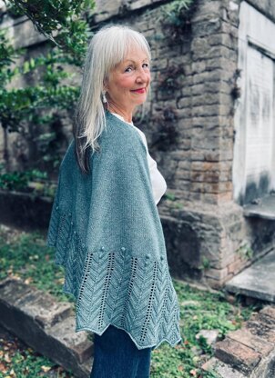About 3 years ago, I began to experiment with a little motif. A leaf, then a vine, then a flower emerged. They multiplied and marched in ranks. At last, I coaxed the little flowers into a circular yoke formation that I've adapted for this pretty wrap.