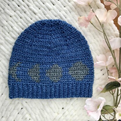 The Moonshine Slouch is a slightly slouchy beanie featuring a moon phase design around the body of the hat. The design is created using tapestry crochet and two colors of worsted weight yarn. Both written instructions and a diagram for the tapestry crochet section are included in the pattern PDF.