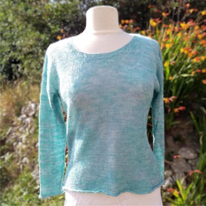 The design is knitted in stocking stitch throughout with naturally-rolling cuffs and hems. It is made from the bottom up, with a 3-needle cast-off at the shoulders and the sleeves knitted on from the shoulders down.
