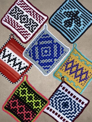 MORE Native American Potholders, #318. 7 new creations inspired by Native American themes will make a colorful addition to your kitchen decor. Great gift idea too! The double thickness potholders are made using worsted weight yarn in your choice of cotton or acrylic. Designs are formed by cleverly placed dropped dc sts worked in front loop of stitch 2 rows below. All color changes are made at the beginning of rows, so you are only working with one color at a time. Includes written instructions as well as optional graphs. Easy to intermediate skill. See our website for a video how-to tutorial showing just how easy the dropped dc stitch is.