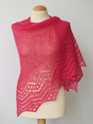 Morello Cerise is a triangle shawl, knit sideways. This design features lace patterning in the tradition of the Shetland Isles. The triangle edging is worked at the same time as the body of the shawlette. Worked at a loose gauge, Morello Cerise is a lovely and airy layering piece.