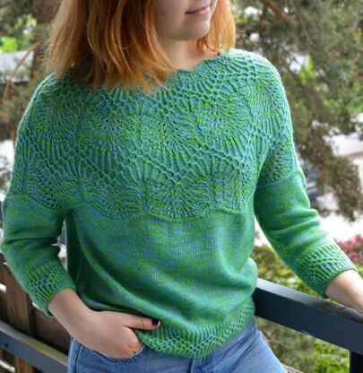It is aseamless top-down sweater with a scalloped neckline and an intricate lace pattern on the yoke while the rest is made in simple stockinette.