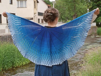 The shawl sits easily on the shoulders and surrounds them similarly to a capelet, ending just under the elbow.