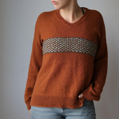 The sweater features a relaxed drop shoulder fit and a top-down, one-piece construction that’s just as low-key. The colorwork pattern adds a touch of contrast around the bust, and this sample features three of the brand new Balayage colorways by Pascuali for an autumnal color scheme.
