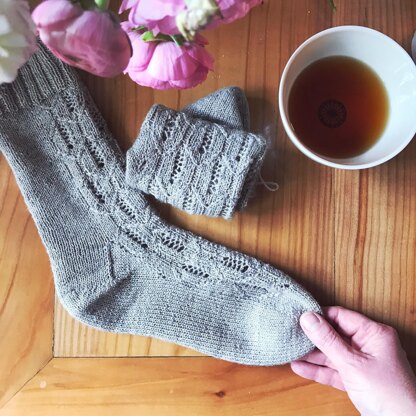 Morningside socks are worked toe up starting with a comfy, curvy toe. Pattern is worked over the front of instep and leg.