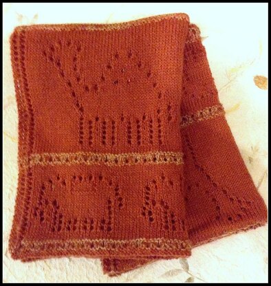 This piece is a relatively generous-sized wrap, measuring approximately 50 x 210cm (20 x 83in) when knit with 4-ply wool on 3.5mm needles.