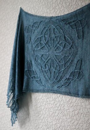 The construction of this lace-weight shawl is rather complex and unusual. The shawl begins with the centre square, worked outwards in the round. Then, two of the edges around the square are filled in with short rows, and the body is worked in stocking stitch, finished with lace ribbing. After this, the other two edges of the square are filled in and rest of the shawl is worked exactly as the other side.