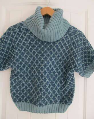 This is a pattern for Mosaic Roll Neck, originally published in Knitting magazine. It has a two colour mosaic pattern on the body with rib collar and edgings.