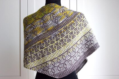 This nature-inspired mosaic shawl is only worked with one color at a time. The color shifts come from the sample using a mini-skein set plus a solid color.