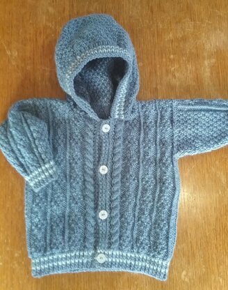 Baby hoodie, age 0-6 months, approx 18" chest. Suitable for boy or girl. Knitted in one piece to armhole