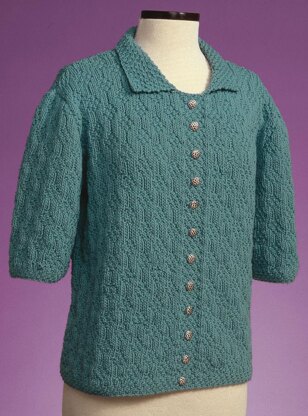 This pullover is offered in 2 sleeve lengths - the short sleeve shown here, or a long sleeve version. The center panel is a faux button band, with small buttons which dress up the pretty diamond motif; the piece is a pullover, not a cardigan.
