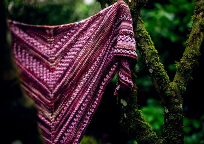 This triangle shawl is a fun and quick knit with a mix, of knit, purl and yarn over stitches. The way the colours intermix help pull out the textures and shapes.