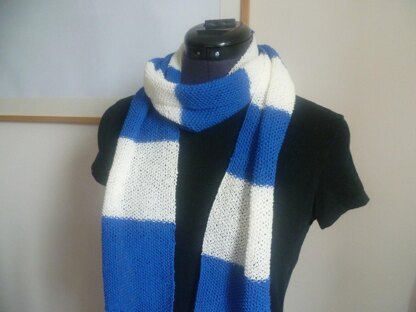 Keep warm at a winter's day match with a classic football scarf with stripes of two alternating colours and tassels on each end. An ideal beginner knit, the pattern uses basic knitting techniques such as knit and purl stitches, casting on and casting off and making tassels. It is designed for a fine 2-ply yarn, but could be easily adapted for a thicker yarn by casting on fewer stitches, and working fewer rows for each stripe. The stitch used is moss stitch.