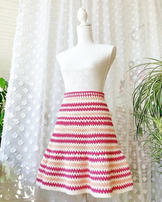 This skirt is made with classic moss stitch worked in rounds from beginning to end.