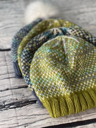 This pattern has three options for the crown. Pick Option One for a very tall and slouchy style; Option Two is slightly more fitted and Option Three is the most fitted. The sample was knitted using Bellissima in Double Denim with You & Me, a variegated yarn with an Option Two crown.