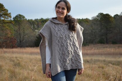 The Mosswood Poncho is a quick-knit pattern that is perfect for easy layering in cool weather. The front features bold cables and crochet bobbles running up the center on a reverse stockinette background and a simple ribbing and slip stitch edging on the sides. The back is solid reverse stockinette. After the shoulders are seamed, a large, cozy hood is knit featuring reverse stockinette and the same ribbing and slip stitch edging. Knit up in Berroco Mercado, an affordable aran weight yarn, available in a variety of earthy shades. Mosswood is the perfect project for knitting and styling in the winter months!