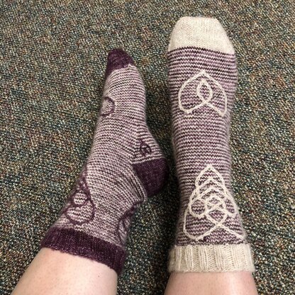 The Celtic knot, in all of its many variations, is a series of knots that are overlapped or interwoven, with no definitive beginning or end. The Celtic knot of motherhood is featured on the leg of these mosaic socks. The knot depicts a parent and child embrace, the two hearts intertwined. This pattern incorporates mosaic knitting, a colorwork method where the pattern is created by slipping select stitches of the MC on CC rows. Written round-by-round instructions are provided along with a charted pattern.