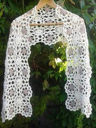 This crochet scarf pattern is made working shell edged flower medallion motifs joining as you go and then filler motifs are worked in to complete the pattern. Crochet using 4ply/fingering cotton.