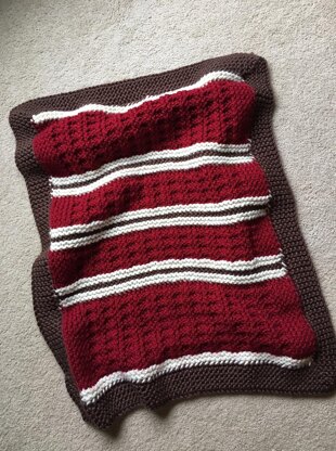 The blanket is knit on any 3/4” gauge loom with a minimum of 54 pegs. The sample blanket was made using the following yarns: All bulky (#5) or super-bulky (#6) weight yarn: Main color: 218 yards - Premier Yarns Deborah Norville Serenity Chunky in Red Ochre Trim color: 162 yards – Lion Brand Hometown USA in Billings Chocolate Stripe color: 50 yards -- Premier Yarns Deborah Norville Serenity Chunky in Pristine