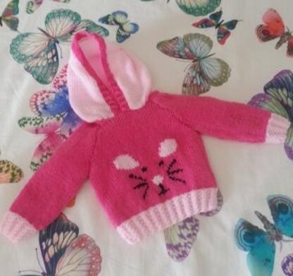 A trendy knitting pattern for a hoodie featuring a cute Mouse for ages 0 to 7 years.