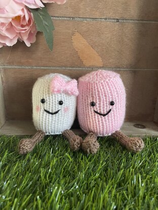 Learn to knit these super cute marshmallows. They are so fun and quick to make, and make a great gift for children and couples. Your marshmallows will measure around 8cm tall (13cm including legs). This is a great pattern for beginner to intermediate level knitters. You will need: 3.75mm knitting needles (US size 5, UK size 9) 3.25 mm knitting needles (US size 3, uk size 10) 50g of DK yarn in white, light pink and light brown Small amounts of black dk yarn 4mm safety eyes (or you can embroider eyes on) Toy stuffing Yarn needle Scissors Blusher (optional)