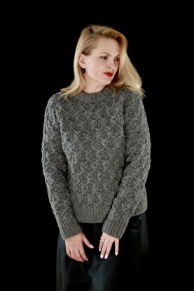 Classic cable sweater is worked flat in pieces and seamed. The collar is picked up and worked in the round. Choose the size with 4–6”/10-15 cm of positive ease. YARN Gilliatt by De Rerum Natura (100% Merino; 273 yards (250 meters) per 100 g skein, Worsted weight). 5 (6, 7, 7, 8) skeins /480 (550, 630, 700, 800) grams; photographed in color Granit. Or 1310 (1501, 1719, 1911, 2184) yards/1200 (1375, 1575, 1750, 2000) meters of Worsted yarn of similar composition.