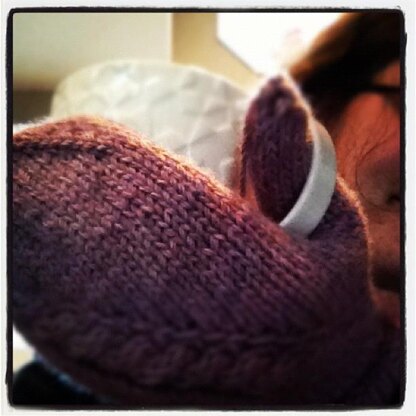 These mittens are constructed from the cuff up, and have a delicate four stitch cable snaking around the outside of each hand. The right and left mitts are constructed in a mirror opposite pattern, so once you’ve got the first one done, the second is a refreshing change!